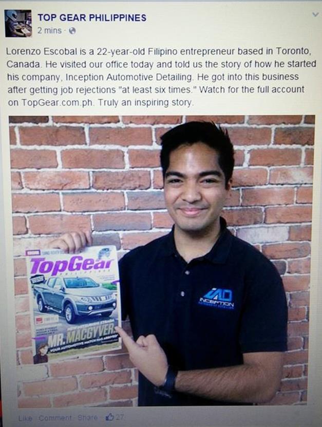 Lorenzo Escobal is a dynamic young man who has achieved tremendous success in a short period. In 2016, at the age of 24, he was nominated as the Young Entrepreneur of the Year for the Mississauga Board of Trade. In 2017, his company, Inception Automotive Detailing won the Consumers Choice Awards for Best Automotive Detailing in 2 regions, Toronto Central and York Region.